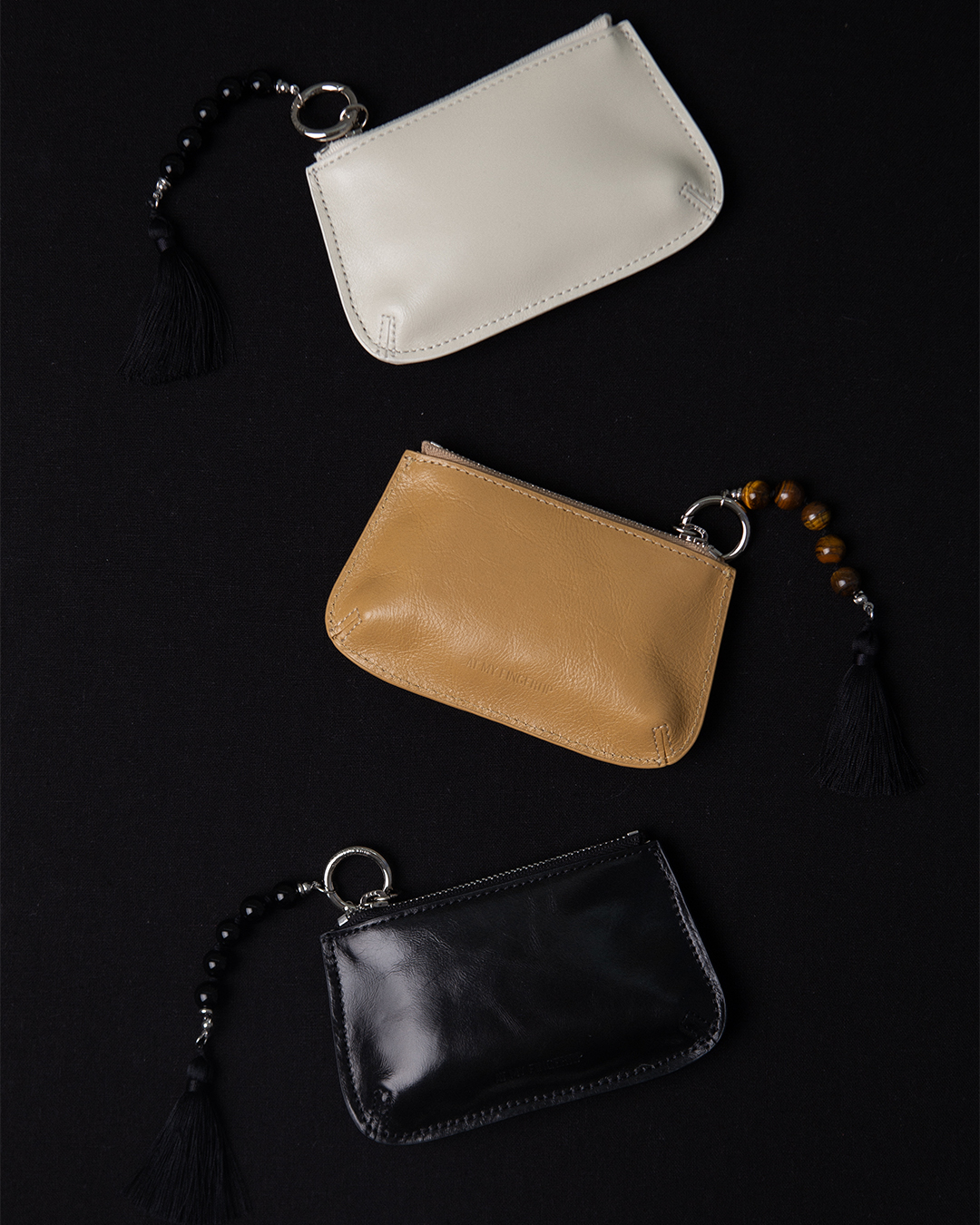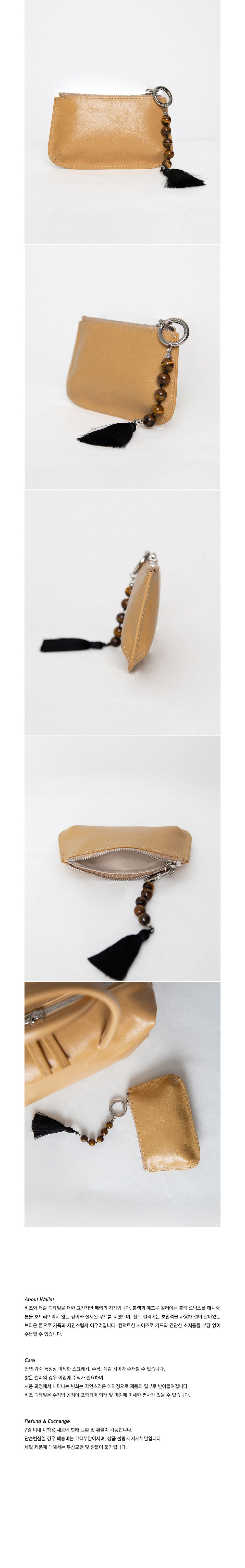 비즈와 태슬 디테일을 더한 고전적인 매력의 지갑입니다. 블랙과 에크루 컬러에는 블랙 오닉스를 매치해 톤을 흐트러뜨리지 않는 깊이와 절제된 무드를 더했으며, 샌드 컬러에는 호안석을 사용해 결이 살아있는 브라운 톤으로 가죽과 자연스럽게 어우러집니다. 컴팩트한 사이즈로 카드와 간단한 소지품을 부담 없이 수납할 수 있습니다.
