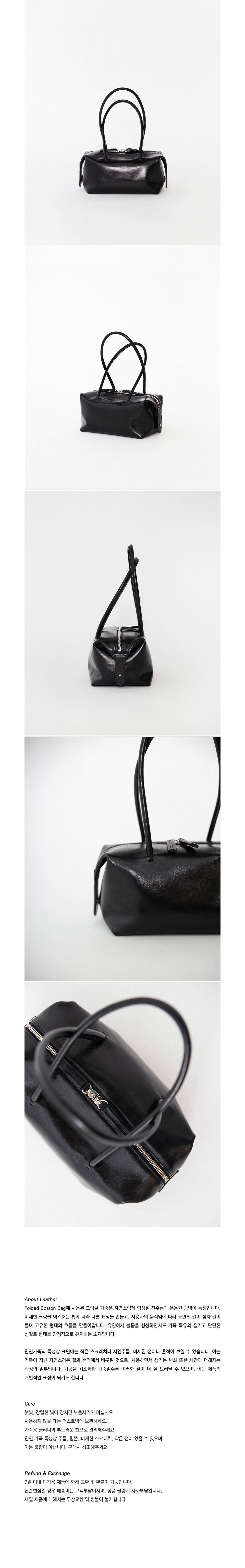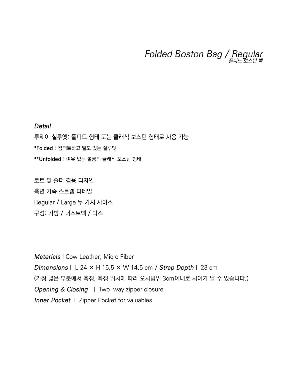 Folded Boston Bag은 사이드 폴딩 구조로 완성된 보스턴 백입니다. 장식을 최소화하고 접히는 구조 자체가 가방의 실루엣을 만들도록 설계했습니다. 양옆의 폴딩 디테일은 자연스러운 볼륨을 만들면서 구조를 안정적으로 유지합니다. 스톤 텍스처가 은은하게 드러나는 소가죽을 사용해 빛에 따라 조용한 광택이 나타납니다. 사이드를 접으면 밀도 있는 폴디드 실루엣으로, 펼치면 클래식한 보스턴 형태로 사용할 수 있는 투웨이 구조입니다. 스타일과 수납에 따라 자연스럽게 형태를 조절할 수 있습니다. Regular와 Large 두 가지 사이즈로 출시됩니다.