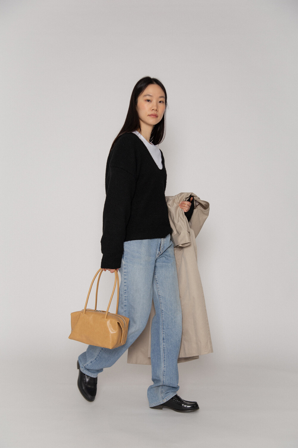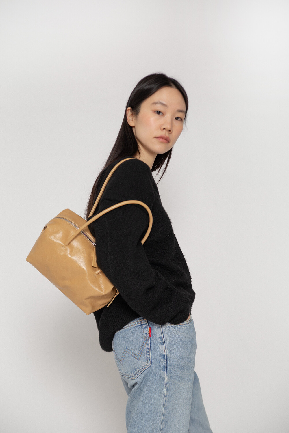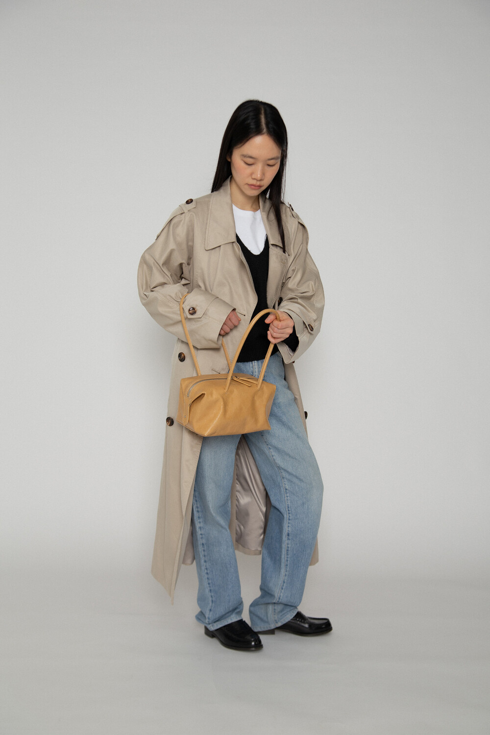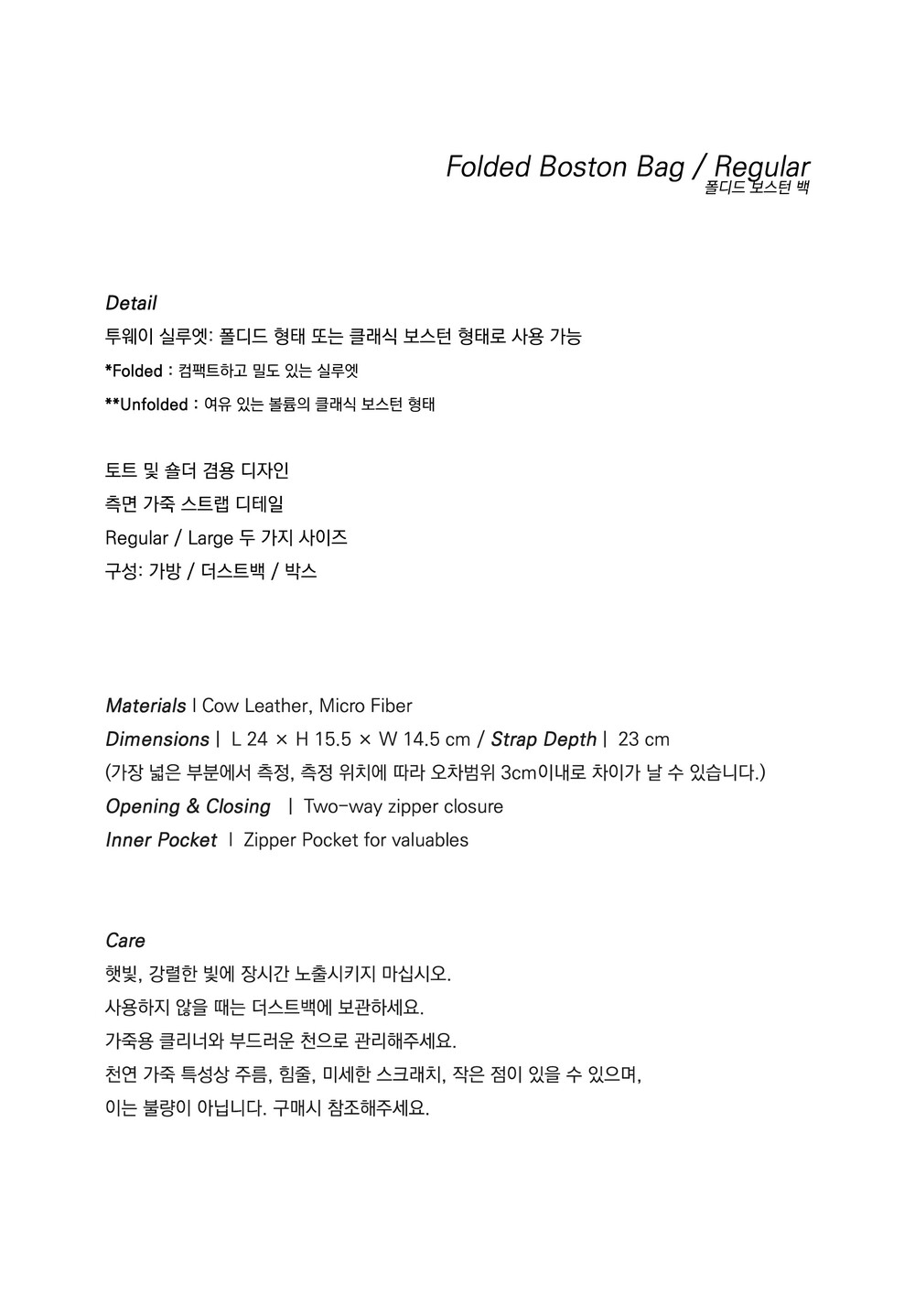 Folded Boston Bag은 사이드 폴딩 구조로 완성된 보스턴 백입니다. 장식을 최소화하고 접히는 구조 자체가 가방의 실루엣을 만들도록 설계했습니다. 양옆의 폴딩 디테일은 자연스러운 볼륨을 만들면서 구조를 안정적으로 유지합니다. 스톤 텍스처가 은은하게 드러나는 소가죽을 사용해 빛에 따라 조용한 광택이 나타납니다. 사이드를 접으면 밀도 있는 폴디드 실루엣으로, 펼치면 클래식한 보스턴 형태로 사용할 수 있는 투웨이 구조입니다. 스타일과 수납에 따라 자연스럽게 형태를 조절할 수 있습니다. Regular와 Large 두 가지 사이즈로 출시됩니다.