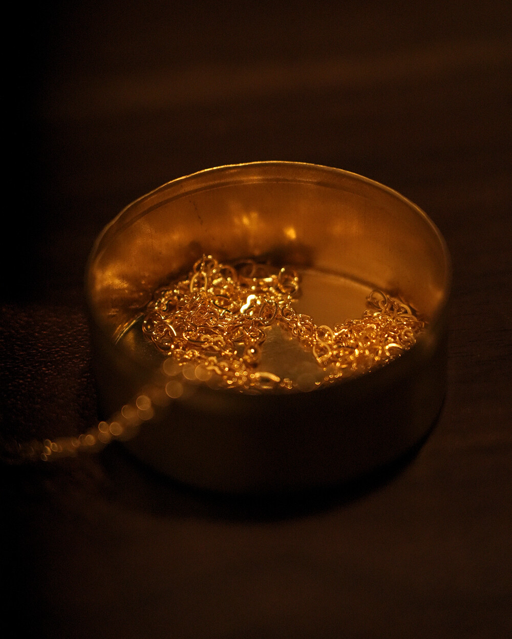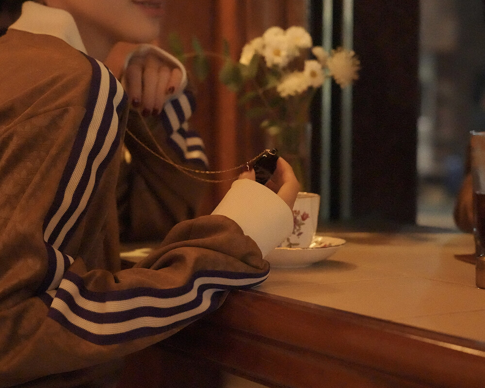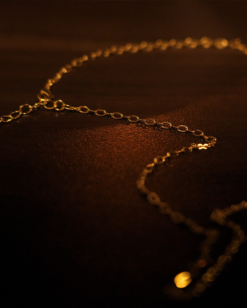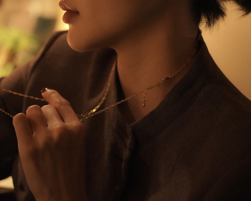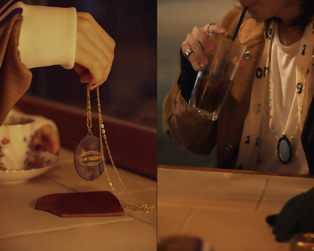 젠더리스한 체인 길이와 깊은 브라운 레오파드, 골드 로고의 조화가 돋보입니다.