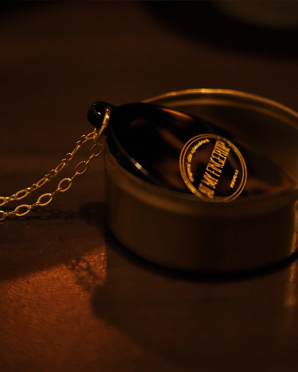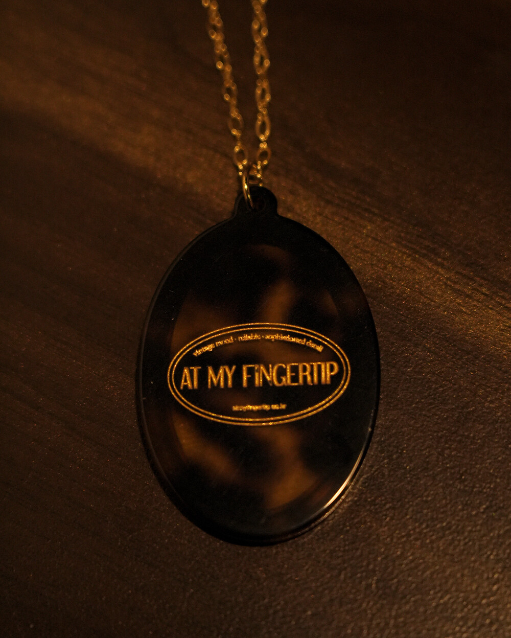 레오파드 무늬의 깊은 색감과 패턴을 지닌아세테이트 소재의 미러 펜던트 네크리스