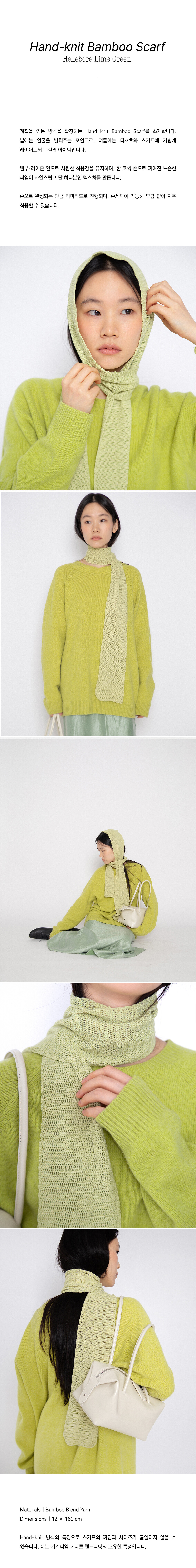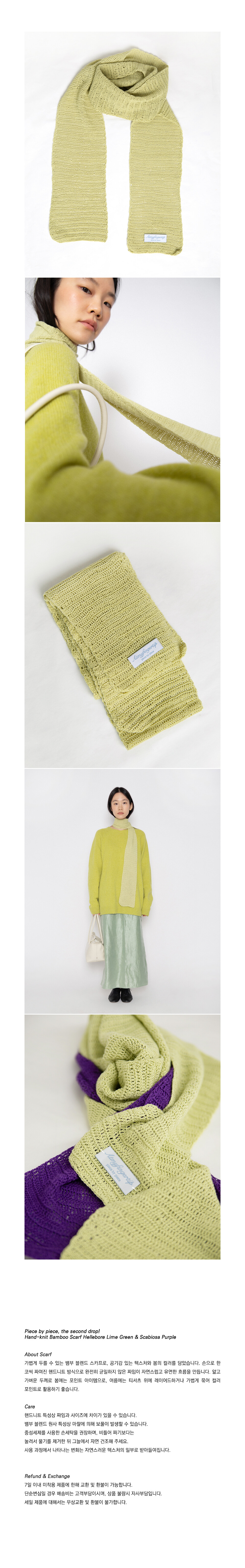 Piece by piece, 이번 드롭에서는 계절을 입는 방식을 확장하는 Hand-knit Bamboo Scarf를 선보입니다. 봄에는 얼굴을 밝혀주는 포인트로, 여름에는 가볍게 레이어드되는 컬러 아이템입니다.