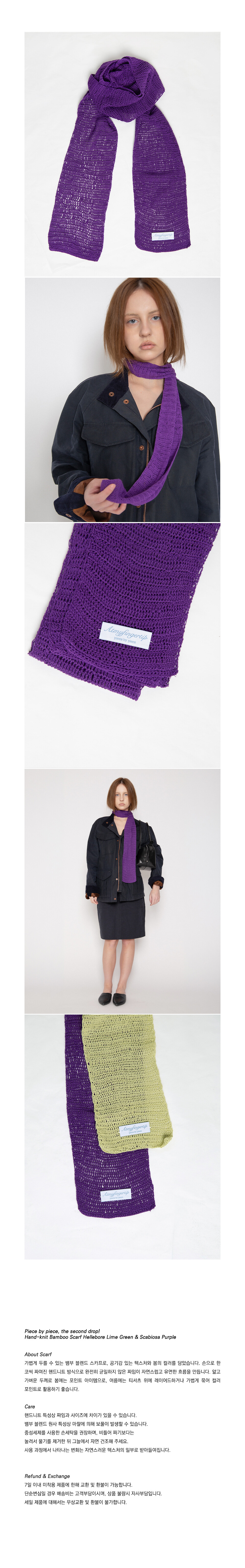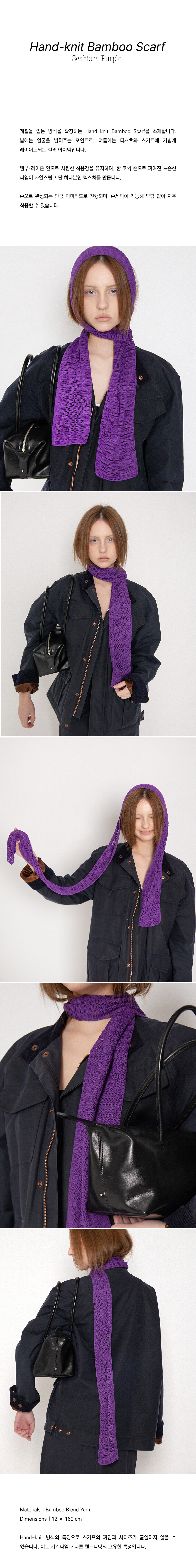 Piece by piece, 이번 드롭에서는 계절을 입는 방식을 확장하는 Hand-knit Bamboo Scarf를 선보입니다. 봄에는 얼굴을 밝혀주는 포인트로, 여름에는 가볍게 레이어드되는 컬러 아이템입니다.